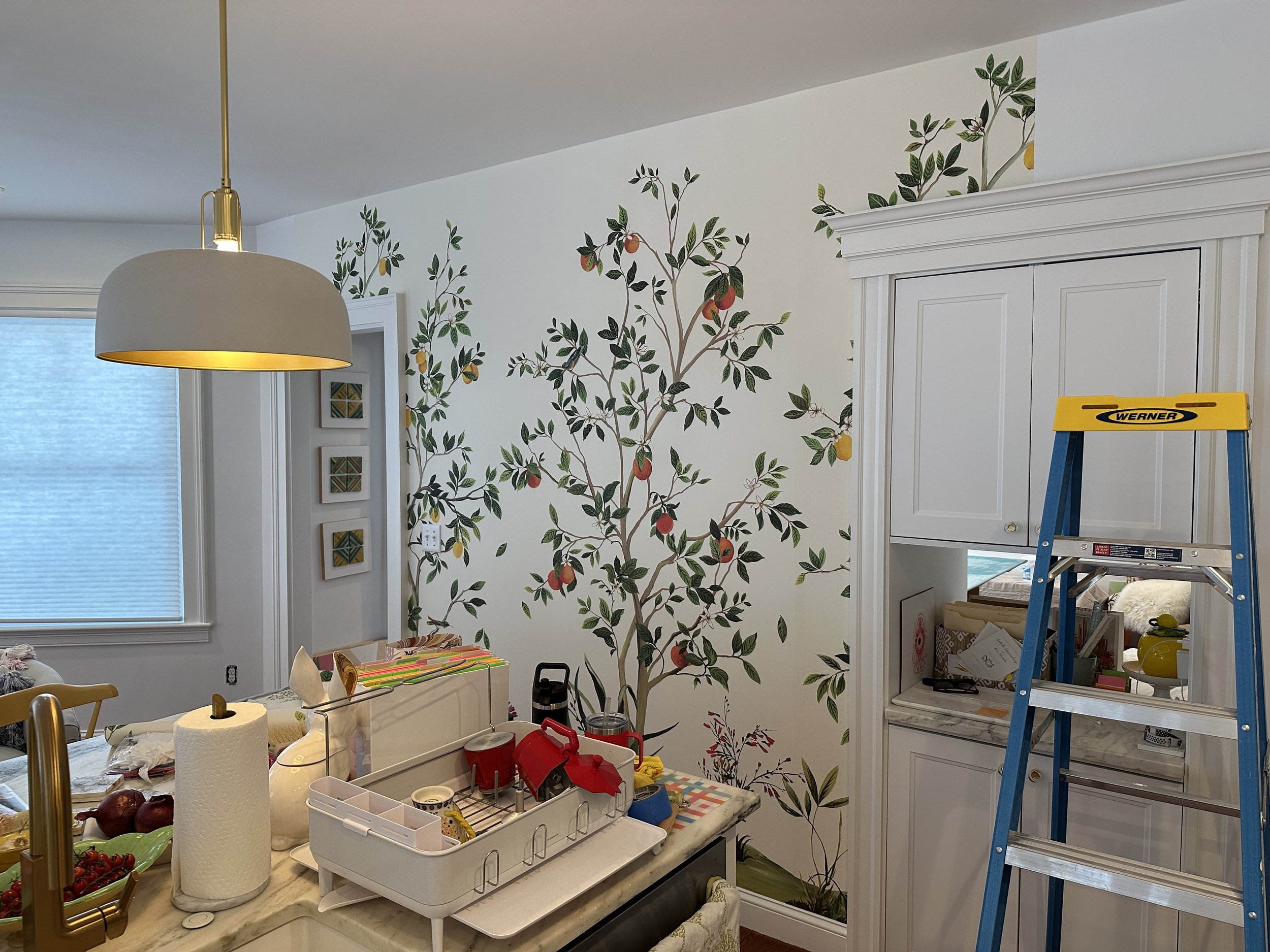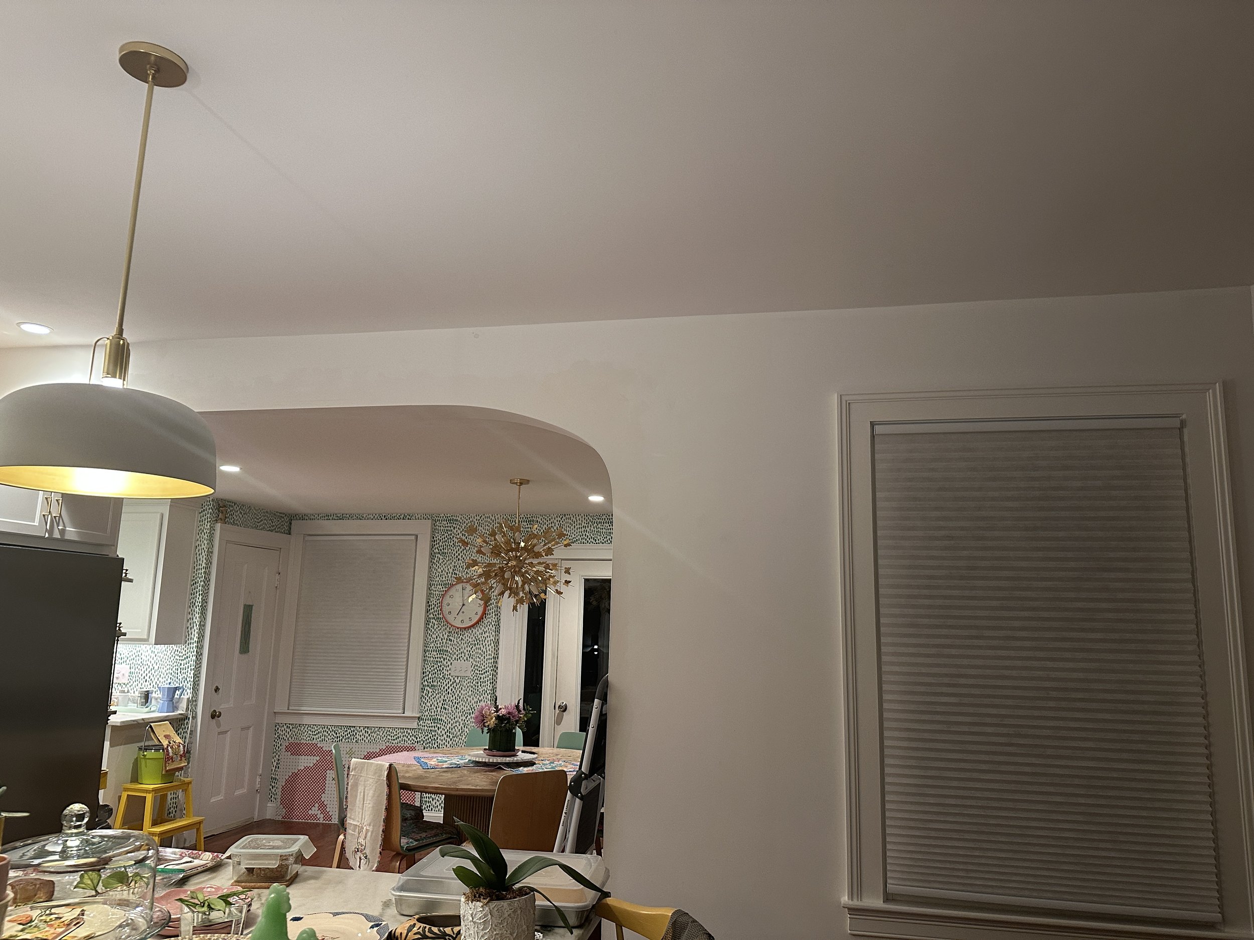 End result, not too shabby (with a little room for improvement)! Mind you, I spent 3 days applying compound then sanding. I had pretty much enclosed the space with painters plastic (think “Boy in the Plastic Bubble”) and was a constant walking collector of sheetrock dust plus we still had to wipe down the entire kitchen/nook space, ‘cause that dust still gets out, but overall, feeling good. And the wallpaper looks great so far (couple more sheets to go)!