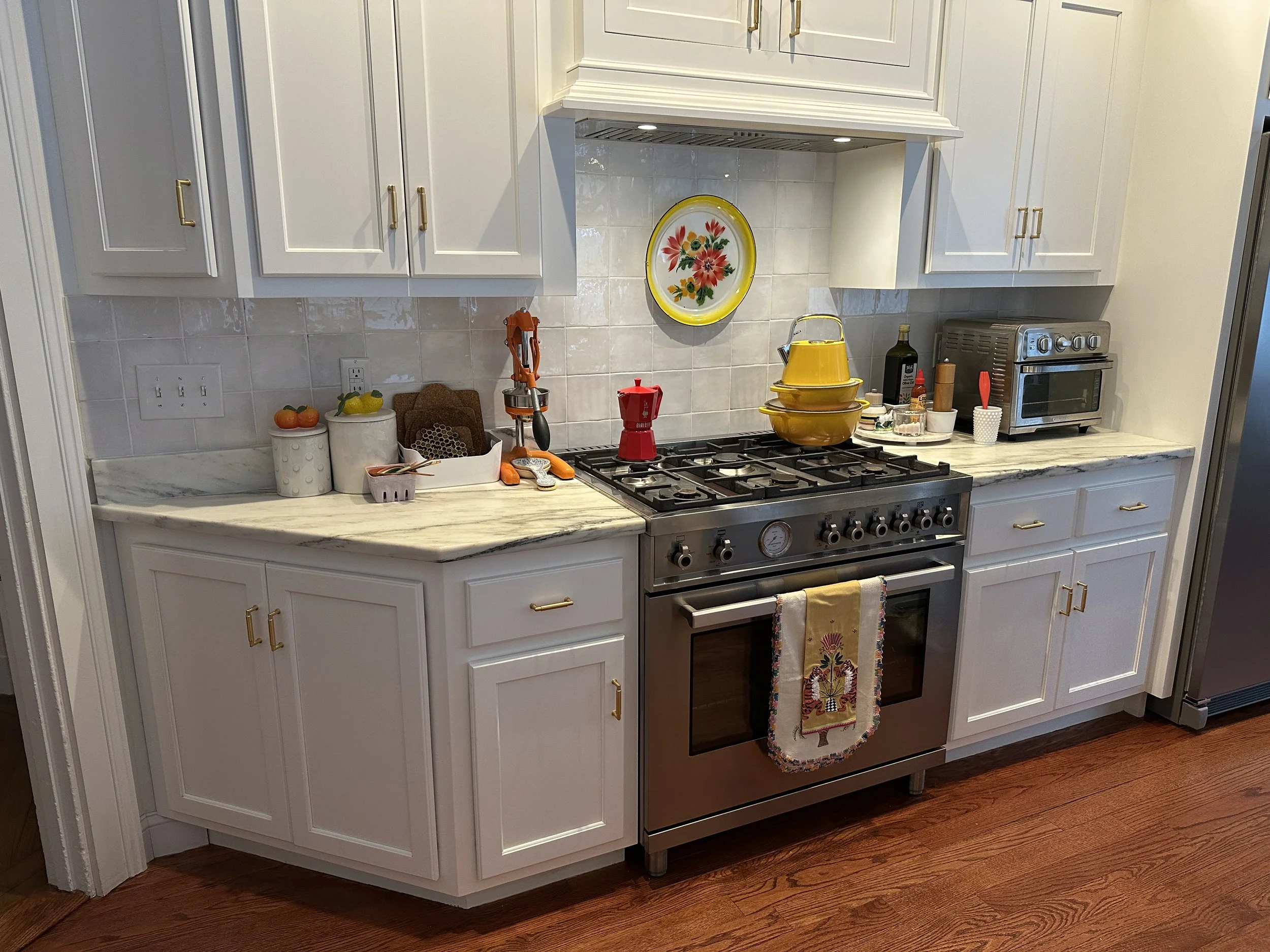 Last week we were talking about the quick little side projects that you sometimes take on in the middle of doing the larger projects, you know, keeps it interesting! While it took a few hours on multiple days, to be expected with dry times and all, the Pulp Kitchen backsplash job is complete (see adjacent pic). The tile and grout colors really do bring out the best of the surrounding cabinets and stove, and now, we have that most practicable and cleanable wall behind the cooking/prep area. Feeling good!