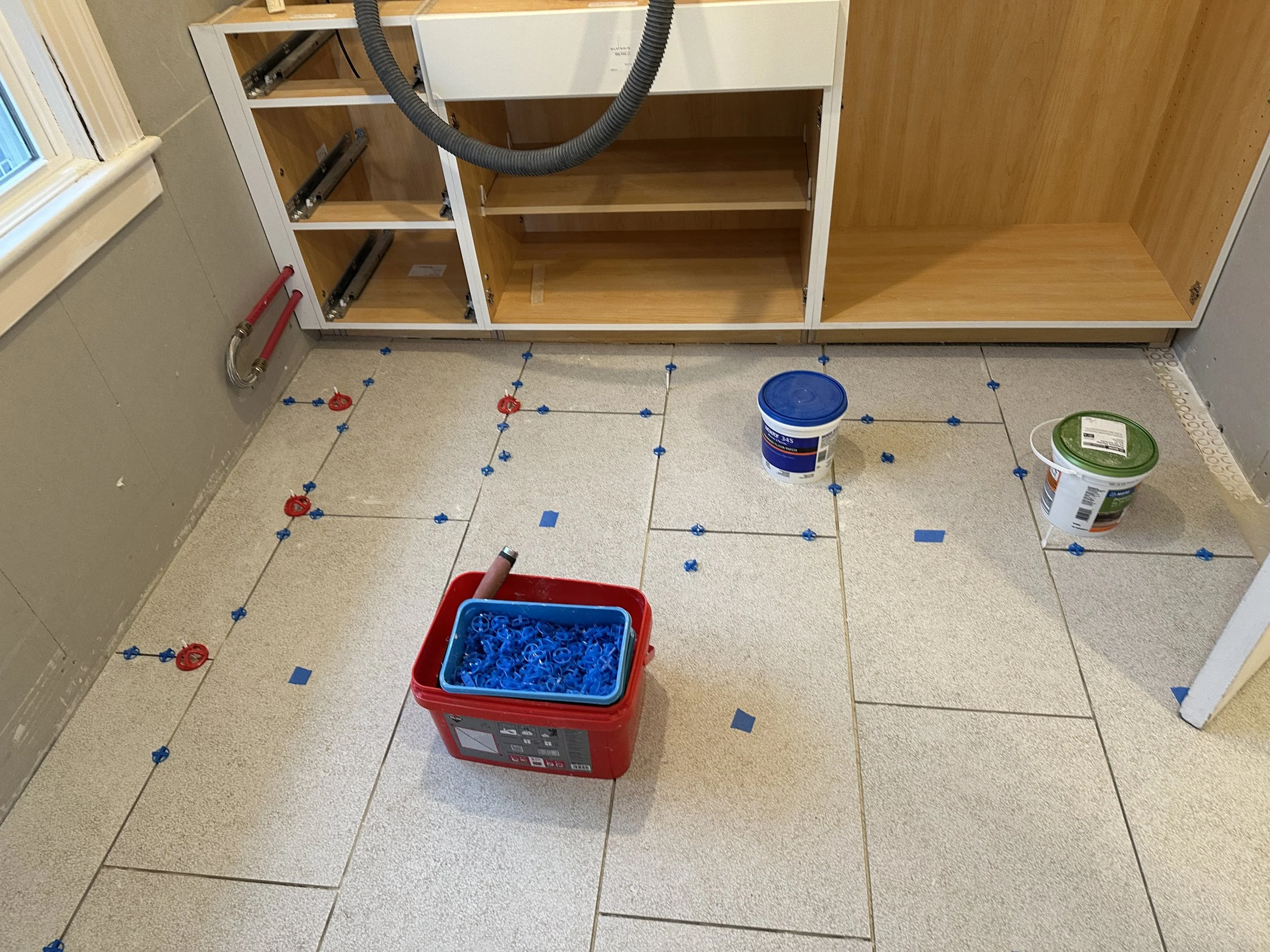 As planned, this past week at the Pulp Bath Reno 2, was all about finishing off the floor tiling and I am happy to report, mission accomplished! The said, certainly a few challenges along the way. I’d mentioned we were using a fairly large format porcelain floor tile (approximately 30” long by 14” wide) which is all fine and good while you are putting down full size tiles. And then…it was time for the cuts!