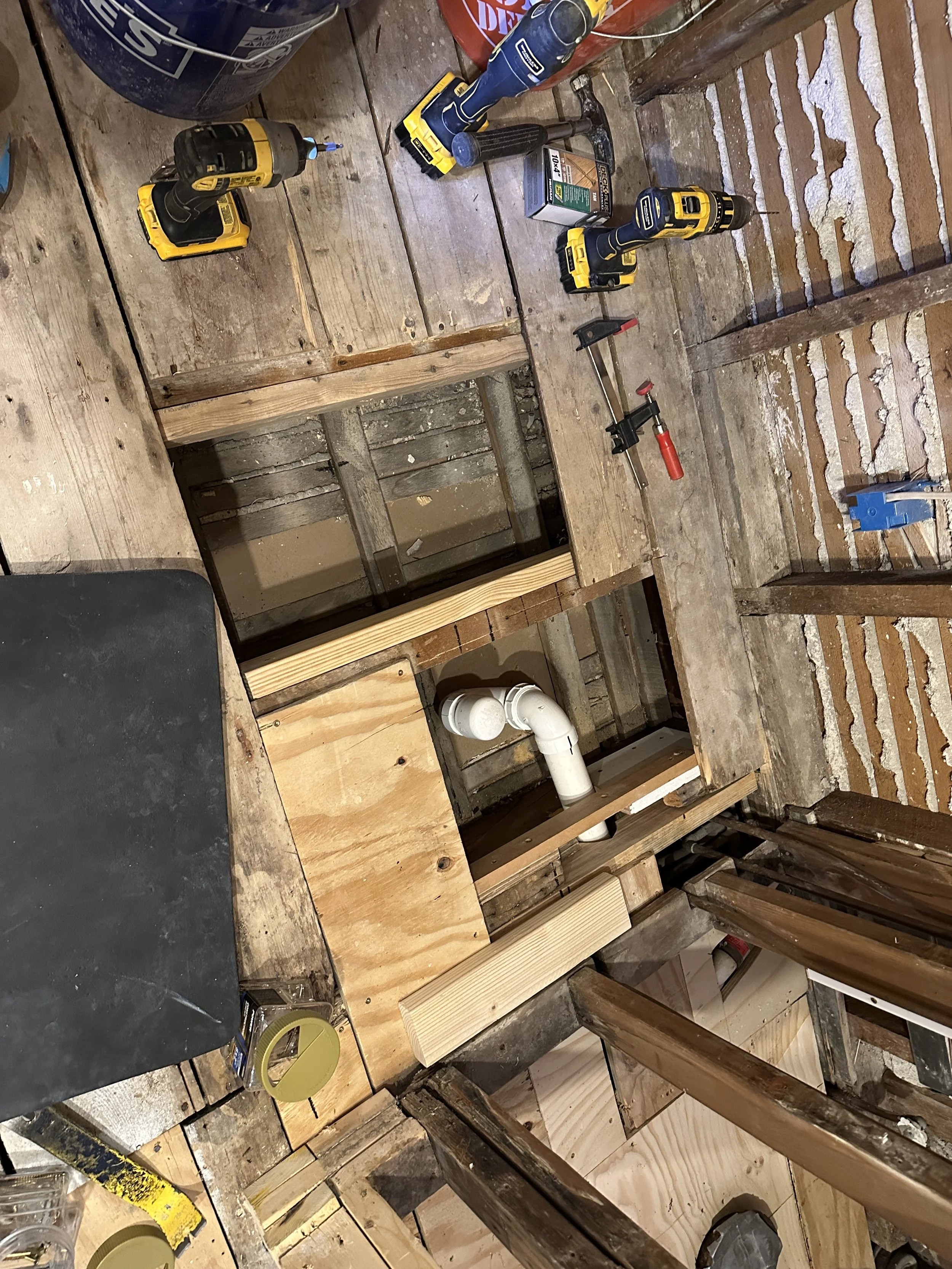 That said, we’ve got our drains for shower and tub exactly where they want to be now. We’ve straightened out the shower water wall (oh yeah, it was quite a bit off) and getting ready to construct the additional water wall (remember, the current one is a little wobbly so we are going to double it up to give it both strength and a pass at the top to reroute our water lines that run up and through the ceiling). Need to land the subfloor support for the new bath tub free standing water spout (it’s heavy and it has a base that sits below the floor) and then start running the finish water lines to all the new fixtures.