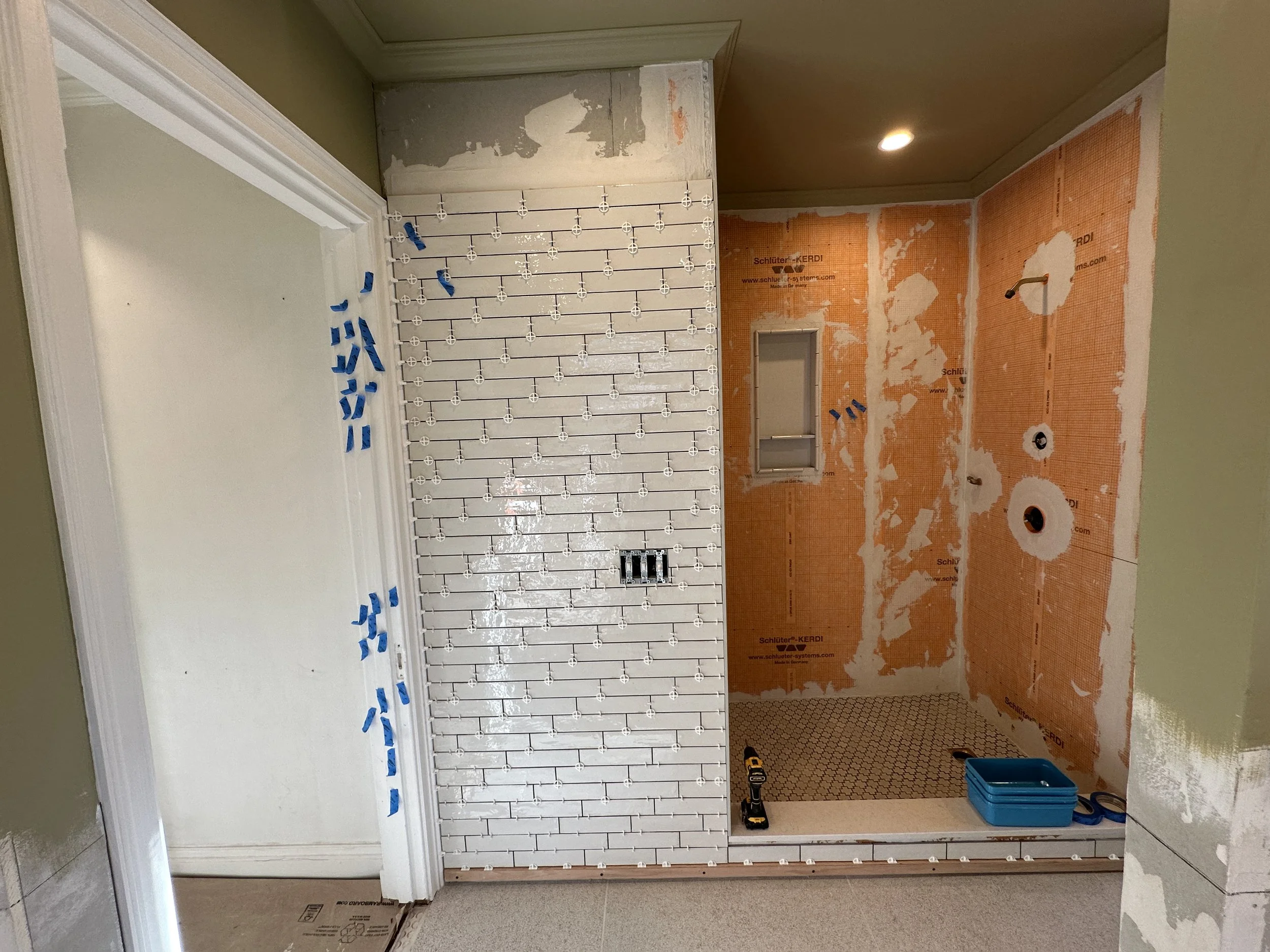 As we left off in last week’s update, we had finished waterproofing of the shower walls and floor and were ready to get busy with tile. We kicked it off with the shower floor tile and the shower cubbies. We went with a cross shaped patterned sheet tile (like sheet penny tile, just in a cross shape) for floor and were able to creatively cut some larger porcelain floor tiles into the tiles that make up the cubbies (2) with a couple nice stone shelves, surrounding both cubbies with some nice ceramic trim tiles. So far so good and we are ready to go for the wall tiling (going with 4 × 4 square tiles for the three shower walls).