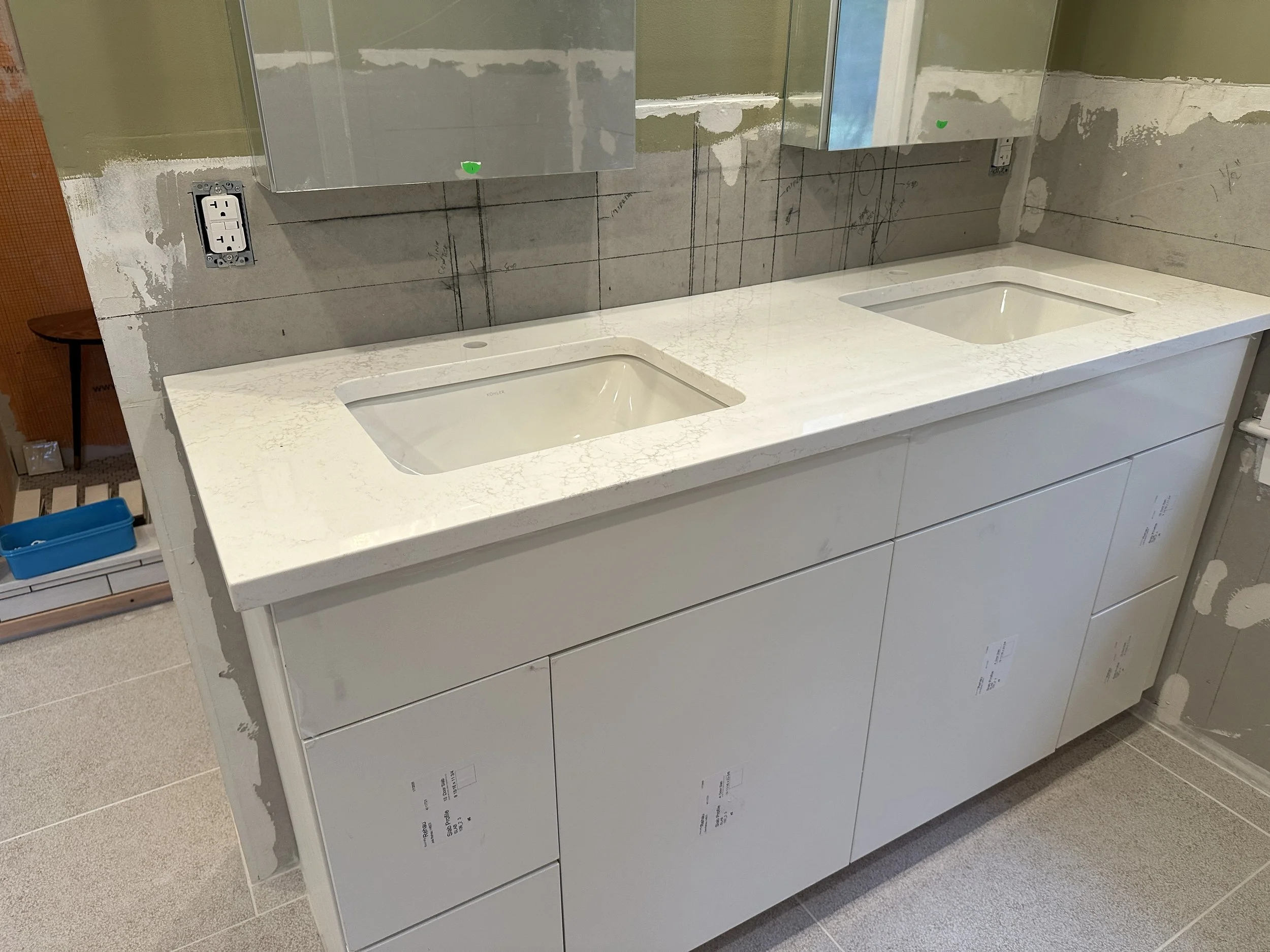 The real game changer, however, came mid-week when the sink vanity and makeup counter tops arrived and were installed! As luck would have it, the stone choice was a direct match for the shower curb (which you might think we had thought ahead about, but we really did not, it just happened). Now remember, you might recall, the original bathroom only had the one sink, so seeing the new counter with the two sinks in it just plain made our days, you know, that feeling of a working room, like you can just taste it. Plus, it’s just really nice to have counters so you can put things on them!
