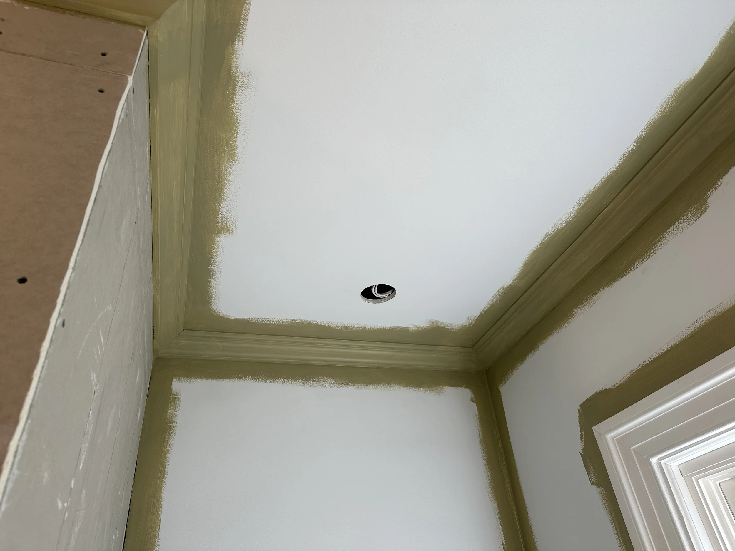With tile in place and pre-grout, we decided to install our crown molding, which itself, is also a bit of a challenge. It was our first crown molding install experience and while we’ve done a ton of trim, chair rails and cove base molding, turns out crown molding is its own special animal! Watched a couple videos and then did a lot of staring, followed by a bunch of test cuts (most of which were bad). Remembered from the videos that you should cut crown molding upside down (which, trust me, gets a bit confusing as you have to do everything backwards). Also remembered that one video mentioned making a form template to hold the crown molding being that it has to be cut with it sitting on the chop saw at a 45 degree angle (crown molding protruding out from your wall to meet the ceiling), which tends to slide and just gets hard to hold on the long pieces. Also, cut a couple inside corner and outside corner samples which made the thought process a whole lot easier (as in, did not have to think, just followed the samples). Lastly, the length of the runs becomes very crucial when you are matching up the pieces for the inside and outside corners (it’s like angles on top of angles and an 1/8” here or there can throw the entire run off). Anyway, after another run to Lowe’s to pick up more molding, and having quite a few leftover miscues, we eventually got the last piece in. Whew!