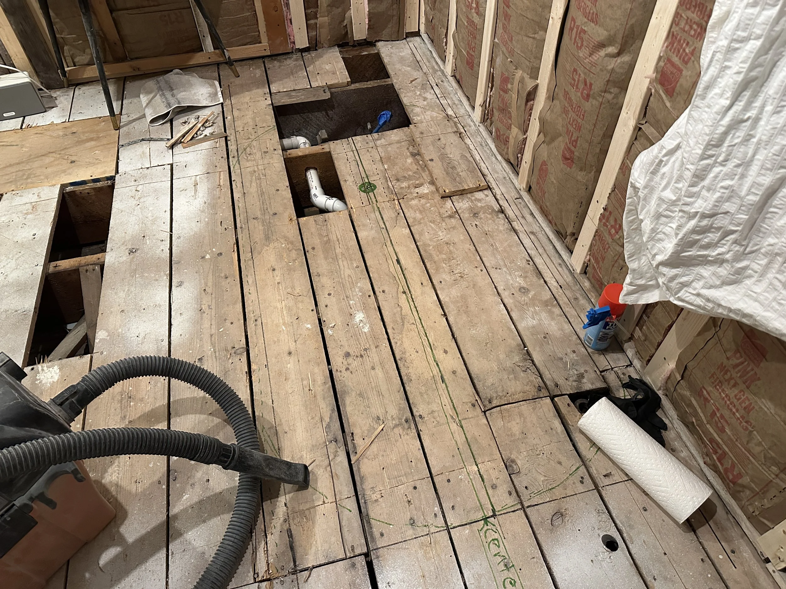 Which brings us to the toilet area adjacent to shower. As we were exploring the floor below the shower water wall, we uncovered a fairly unstable sub-floor there as well. In an effort to the incorporate the drains, vents and water feeds (pretty much everything in the room runs through the toilet area) much of the supporting structure had been cut to allow for it all. Oh yeah, and it’s not level. No worries, now is the time to do it right and do it right we will!